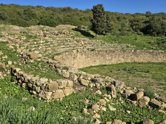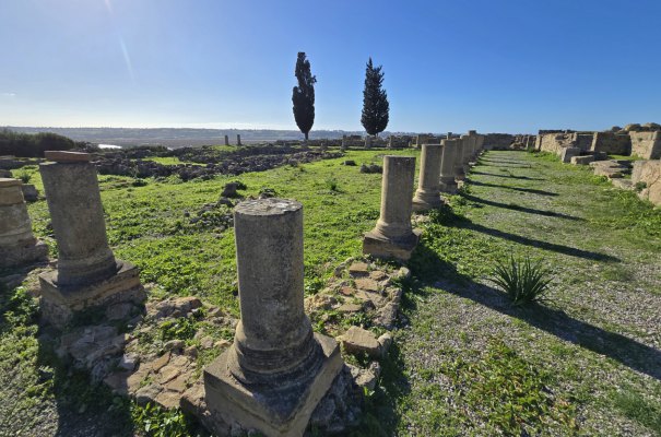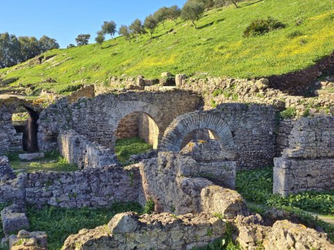 Notre objectif du jour : Larache. On s'arrête au site archéologique de Lixus. Cité qui fut fondée par les phéniciens et resta active jusqu'aux Romains. Elle était idéalement située au dessus des méandres du fleuve Louxos. On y a retrouvé des vestiges d'activité liée au poisson (salaison, fabrication d'une sauce, le garum). De nombreux bassins subsistent. Sous le soleil, la promenade est agréable et les vestiges intéressants. Sur le site on découvre une plante qui nous était inconnue : le Capuchon de moine.