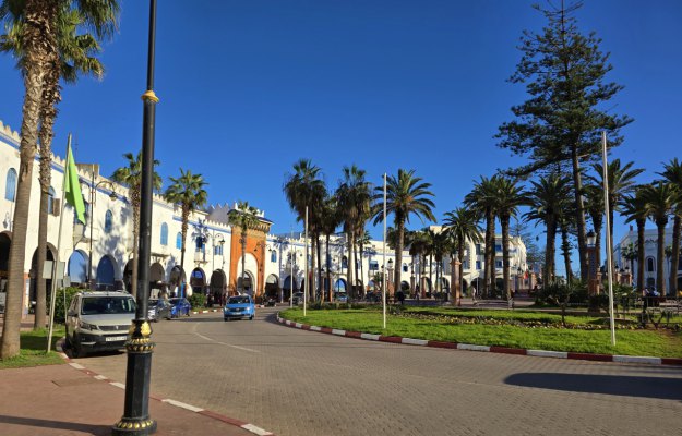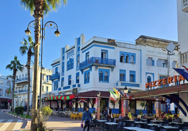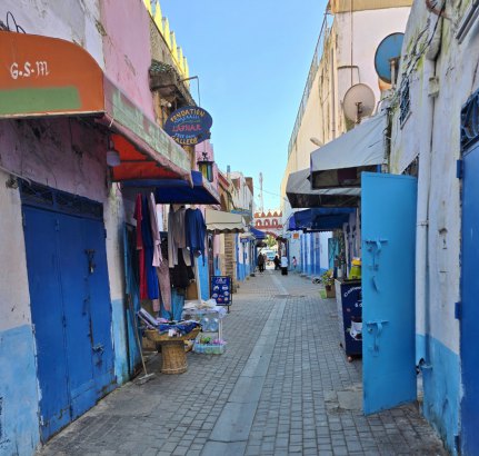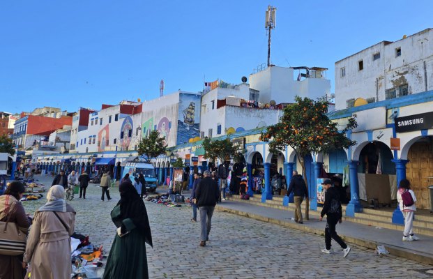 Puis direction la ville de Larache. Autour du port, il y a beaucoup d'activités : restaurants faisant griller du poisson, étalages de poissons. Avant d'aller s'en procurer, on fait un tour en ville. Elle est étagée sur la colline : habitat resserré, murs bleus, petites échoppes de produits nécessaires (cordonnier, couturier, primeurs, fleuriste, épicier... ) rien pour les touristes. Tout ceci, bien qu'entretenu, semble un peu délabré... mais les gens ont le sourire. En haut des ce quartier, une porte débouche sur la belle place de la Libération.