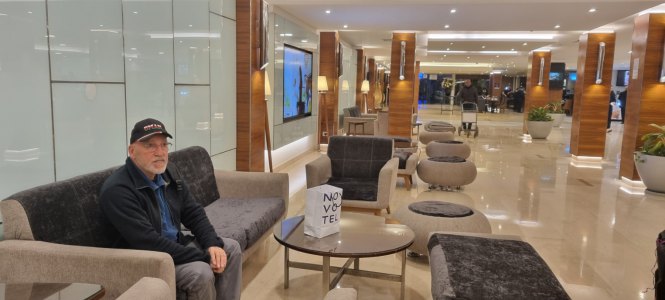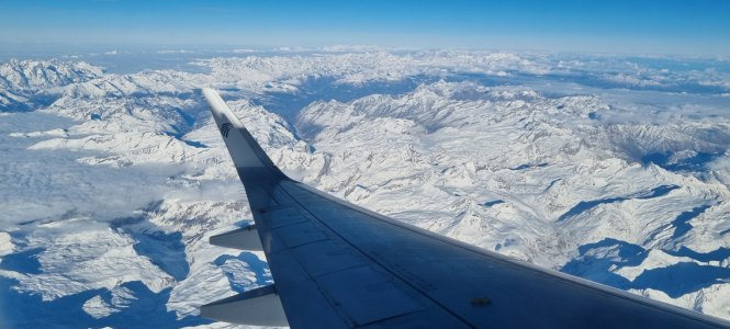 Donc lever à 6h30, route jusqu'à Chambéry. Là, on laisse la voiture chez notre fille Céline. 25 mn de marche pour rejoindre la gare routière avec nos bagages. Le temps est froid et humide, une légère bise nous transperce. Le bus, un Blablacar (19€ pour 2) nous dépose, 1h40 plus tard à l'aéroport de Genève. On est bien en avance, alors on se paye un vrai repas avant d'embarquer (quand même 63€ pour un plat chaud et un gateau pour 2).