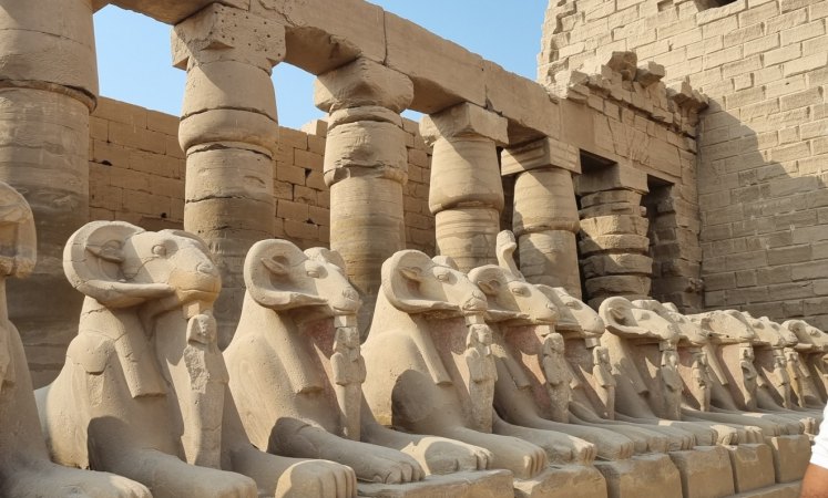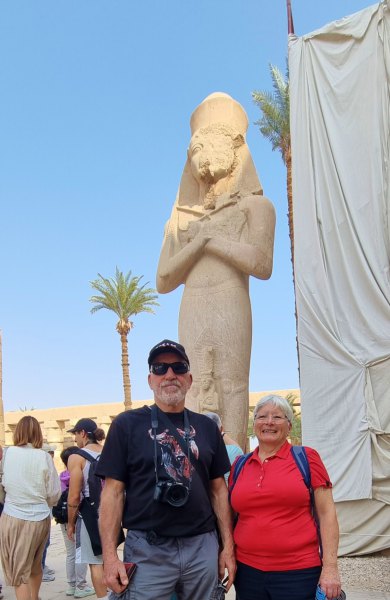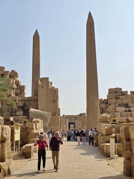 Dès notre arrivée nous faisons connaissance avec notre guideSayed puis nous nous dirigeons vers le temple de Karnac. Le temple de Karnak, dont le nom provient de l’arabe « al-Karnak » désignant une ville fortifiée, est en réalité un ensemble de temples entourés de trois enceintes. Pendant 2000 ans, depuis le règne de Sésostris Ier (environ 2000 avant J.-C.) jusqu’à la dynastie des Ptolémées, les pharaons ont construit, détruit et modifié les innombrables chapelles, temples et pylônes qui constituent le site de Karnak, nom moderne donné au temple d’Amon à Thèbes. Selon les croyances des anciens Égyptiens, Thèbes était le lieu de la création du monde, et c’est depuis le temple de Karnak que le dieu Amon-Rê intercédait avec le monde des vivants. Le site s'étend sur 24ha. À l’entrée, 40 sphynx à tête de bélier conduisent jusqu’à la grande salle hypostyle avec sa spectaculaire forêt de colonnes. Des murs gigantesques, des sculptures incroyables, des forêts de colonnes et partout des bas-reliefs, des hiéroglyphes. Notre guide nous parle des dynasties égyptiennes, du dieu Amon, nous explique beaucoup (trop) de choses. Les visiteurs sont innombrables mais cela n'est pas trop gênant : ce qui est à voir est en hauteur ! On finit la visite par l'allée des sphinx qui reliait ce temple et celui de Louxor.