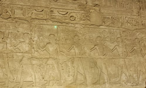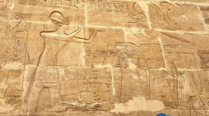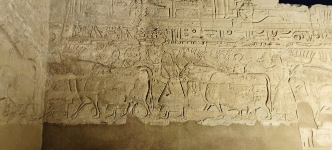 Dans les autres salles on admire une multitude de gravures. Les parois du temple se parent d'hiéroglyphes et de bas-reliefs. Le pylône d'entrée dévoile des scènes illustrant la célèbre bataille de Qadesh (1285 av. J.-C.), affrontement entre Ramsès II et les forces hittites. Puis le roi offrant animaux, oiseaux et poissons à Amon et Amonet ; le pharaon sacrifiant un oryx devant Amon ; ou encore le souverain portant des vases d'onguent sacré. Les bas-reliefs ornant la grande colonnade narrent le voyage des barges royales et divines sur le Nil, entourées d'une foule massée sur les berges. 19h30, retour au bateau. Repas en groupe puis au lit.