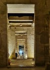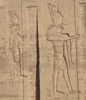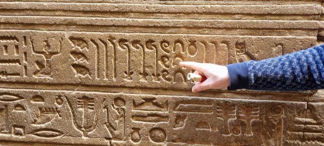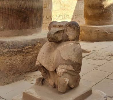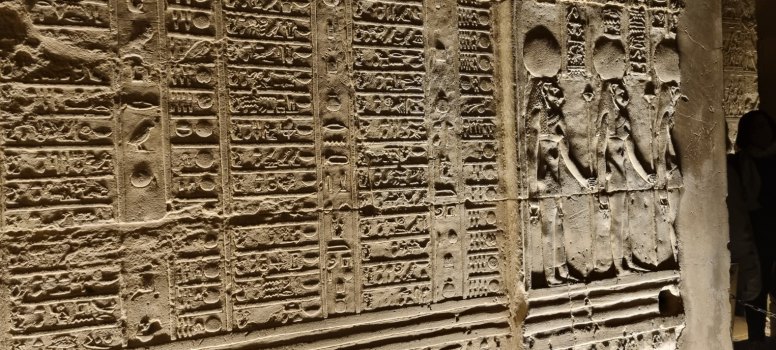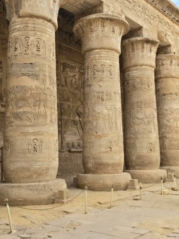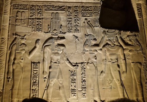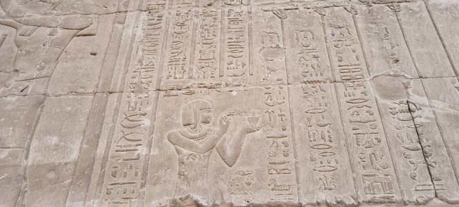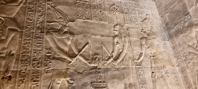 En début de soirée le navire fait escale à Kom Ombo. Nous allons y visiter un temple double : d'un côté il célèbre le dieu du mal le dieu crocodile Sobek , la déesse Hathor et le dieu fils Khonsou et de l'autre , le dieu faucon Haroéris, la déesse Tasentnefret, la "Bonne sœur", et au dieu fils Panebtaoui, le "Maître des Deux Terres", qui symbolisent le bien et la guérison. Les personnages gravés sont extraordinaires de netteté et ici ceux du bas sont en meilleur état que ceux du haut car ils sont longtemps restés enfouis dans le sable. Notre guide en profite pour nous expliquer le calendrier égyptien (ou calendrier copte) encore utilisé pour l'agriculture. Il avait 3 saisons : l'avant crue, la crue et l'après crue, le Nil rythmait la vie. (Depuis la construction du barrage, plus d'inondations). Donc 3 saisons de 4 mois formés de 3 semaines de 10 jours.... et les 5 jours qu'il manquait étaient pour prier, et donc faire des offrandes : tout cela est gravé dans la pierre !