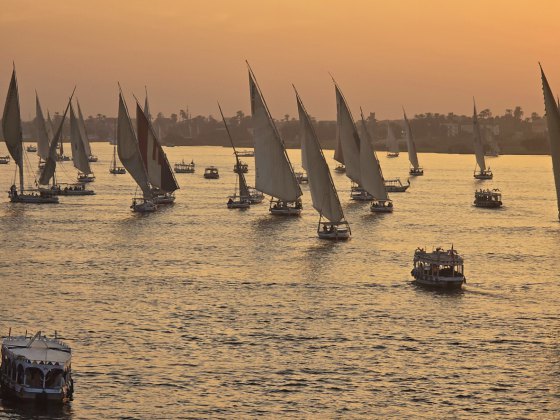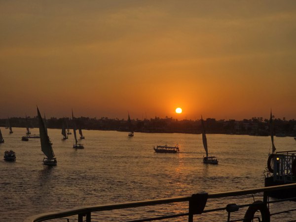 Repas avec beaucoup de choix, puis on peut enfin se reposer un peu dans la cabine. C'est bien équipé, avec un lit gigantesque. Seul inconvénient, notre bateau est à quai, coincé entre 2 autres hôtels flottants donc pas de vue. A 16h30, on monte sur le pont supérieur, c'est déjà l'heure du coucher de soleil. Les felouques se détachent dans le soleil couchant.