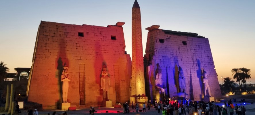 C'est l'heure choisie par le guide pour aller visiter le temple de Louxor. On y arrive aux dernières lueurs du jour, on profite des jeux de lumière. La façade est vraiment magnifique avec ses tons rouges et bleus. Le pylône (ce gros mur) colossal érigé sous Ramsès II s'étend sur 65 mètres de largeur et s'élève à 24 mètres dans le ciel égyptien. Le jumeau de l'obélisque de La Concorde se dresse à l'entrée entouré de 6 statues gigantesques (15m de hauteur) qui représentent Ramsès : debout bras repliés (signe qu'il est mort), debout une jambe en avant (il marche) et assis. L'obélisque de granit rose haut de 23 mètres, pèse approximativement 227 tonnes.