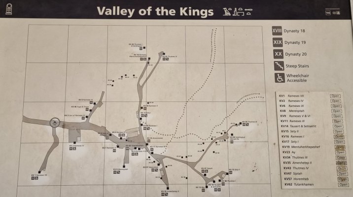 Aujourd’hui, le site compte 64 tombes découvertes, numérotées dans l’ordre de leur découverte (KV1 à KV64). Elles offrent un témoignage inestimable sur les croyances funéraires, l’art et la vie des anciens Égyptiens. Elles se présentent toutes de la même façon : une sorte d'entrée de cave, derrière un couloir, qui descend plus ou moins jusqu'au tombeau en granit rose. Les parois sont décorées de gravures colorées. Avec notre prix d'entrée, on peut en visiter 3.