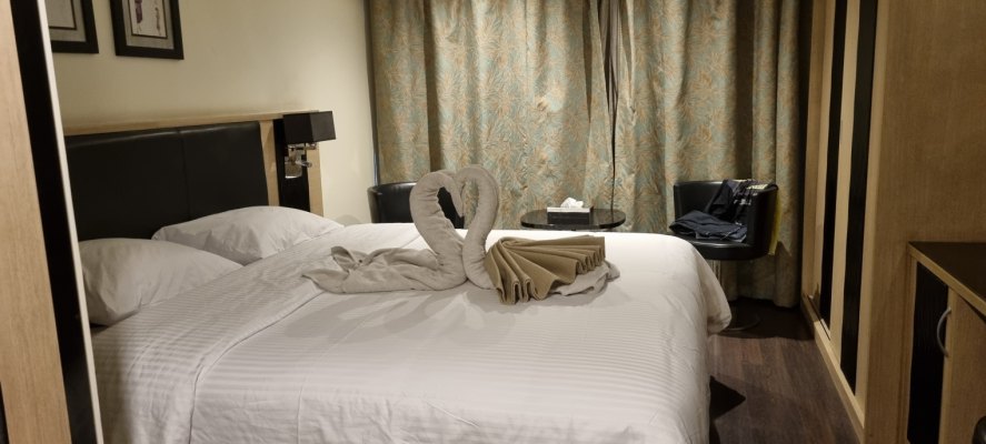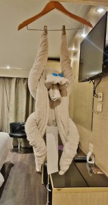 Dans la chambre, un singe nous attend : encore une œuvre de nos plieurs de serviettes (Ils attendent dans le couloir, récompensés par nos oh! ah!).