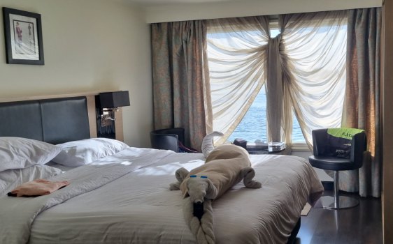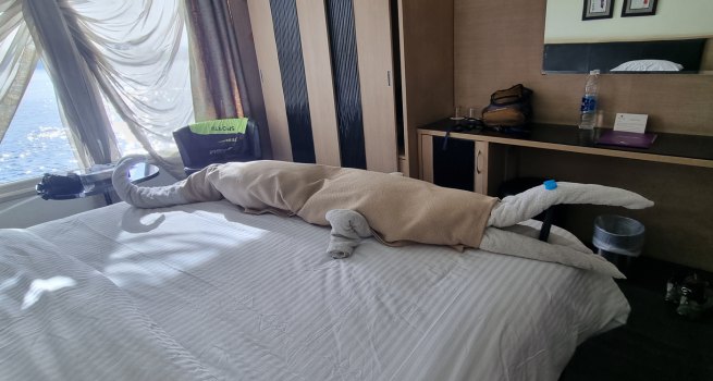 A 13h, nous sommes de retour au bateau. Le service de chambre est passé : lit refait, avec une décoration, 2 cygnes faits avec les serviettes de toilette.