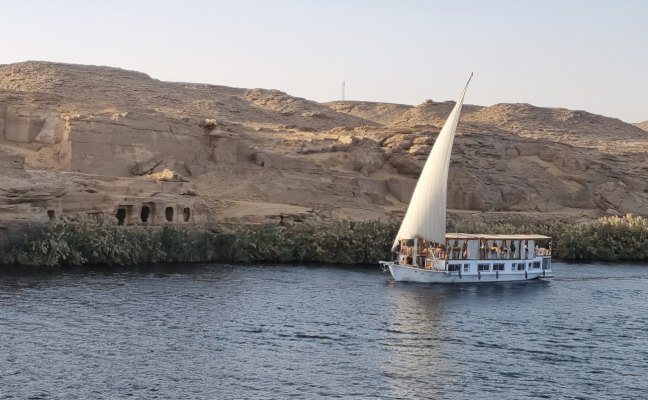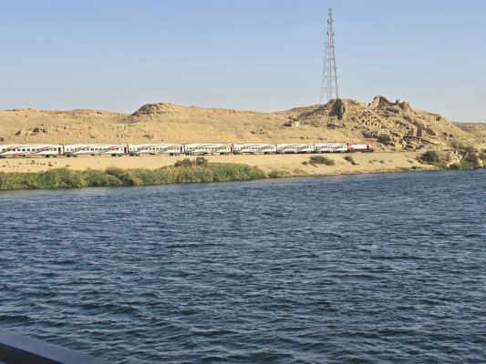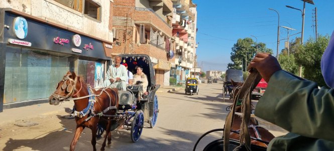 En naviguant, on a été témoins d'une scène incroyable : une barque a traversé le fleuve à la rame devant notre bateau, se dirigeant droit sur un autre navire. On avait peur pour ses occupants. Au dernier moment, ils se sont mis parallèle à ce bateau, l'homme debout a jeté un filin qui s'est accroché au gros bateau. Et les voilà en remorque ; on aurait dit un skieur nautique. Puis celui debout s'est mis à crier, agiter des tissus décorés. Un touriste sur le grand bateau est sorti sur un balcon. Ils ont entamé des discussions, quand ils furent d'accord, l'égyptien a lancé le tissu puis a tiré sur sa corde pour rapprocher la barque afin de récupérer l'argent. Que de risques