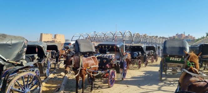 Ce lundi, on part en calèche pour la visite du temple de Erfoud, le cheval est poussif, les roues voilées... on danse et lorsqu'on passe un dos d'âne on saute jusqu'au plafond. Ce temple est le plus récent et le mieux conservé (car il est resté enfoui dans le sable jusqu'aux années 1800). Il a été construit à l'époque de l'invasion par les grecs, ce qui fait que les gravures ont évolué, les êtres sont plus réalistes (nombril, poitrine pour les femmes....). Sur les murs les gravures racontent des histoires : celle du dieu Hamon qui remonte le Nil sur sa barque puis revient, celle des fabricants de parfums, celle de la bataille du roi avec l'hippopotame qui représente Seth... on ne peut pas tout retenir, toutes les parois sont finement gravées du sol au plafond, à 20 m de hauteur !