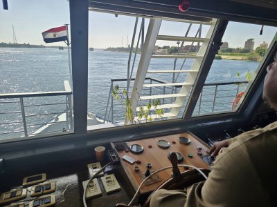 De retour au bateau, on peut entrer dans le poste de pilotage. Le pilote, assis en tailleur, tient la barre avec les pieds et guide le bateau au joystick, les yeux rivés sur l'horizon. Le Nil a une largeur entre 500 et 700m, mais comme 280 bateaux comme le nôtre le parcourent il faut être attentif. De plus ce fleuve est peu profond, 7 à 8m, et le navire a un tirant d'eau de 1m40.