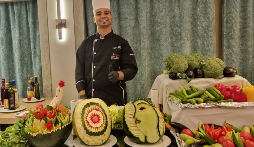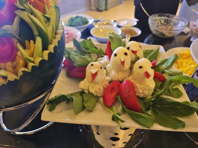 Sur ce bateau, 72 personnes travaillent (45 jours embarqués, 15 jours chez eux). Tout le personnel est souriant et attentif : au buffet, tout est bien présenté, les chambres sont nettoyées chaque jour et le personnel fait une décoration avec les serviettes de toilette, hier des cygnes, aujourd'hui un crocodile.