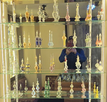 Retour côté ville où nous arrêtons dans un commerce d'huiles essentielles. Assouan est réputée pour cette production. Elles sont extraites à froid. Elles n'ont pas d'alcool, donc pas d'évaporation. Ensuite on teste, il y a les essences parfumées simples, les mélanges (qu'ils nomment par le nom de grands parfums) et les huiles médicinales décrites pour leurs vertus. On se laisse tenter par un Musk aux vertus anti migraine (35€ les 50ml.... on ne sait pas si c'est cher ou non, on n'y connaît rien !).