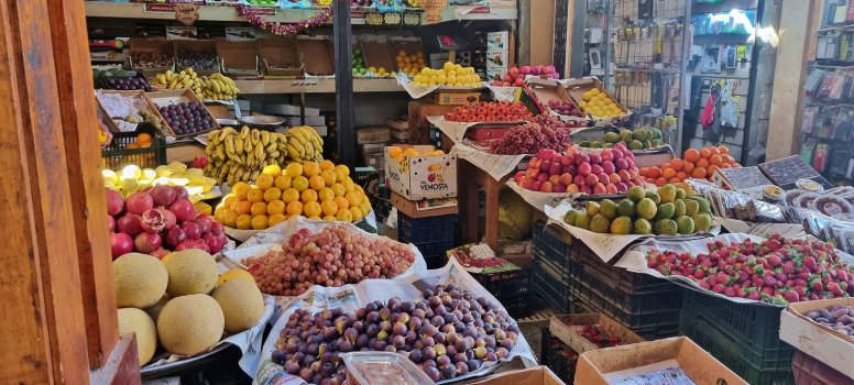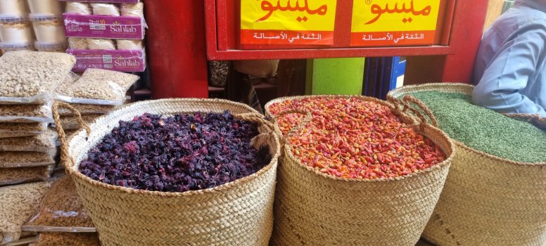 Puis le marchand de teeshirt plaisantant, prêt à déballer son magasin. Entre temps on passe devant le boulanger et ses petits pains plats, le boucher aux gros quartiers suspendus à des esses : ici du chameau, là du mouton, mais la star c'est le bœuf ! Les épices embaument les allées.