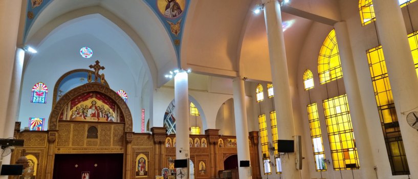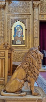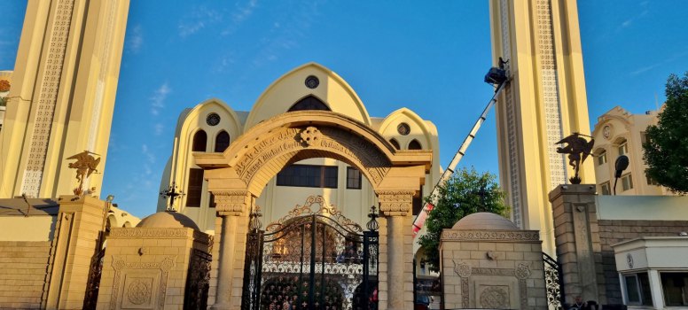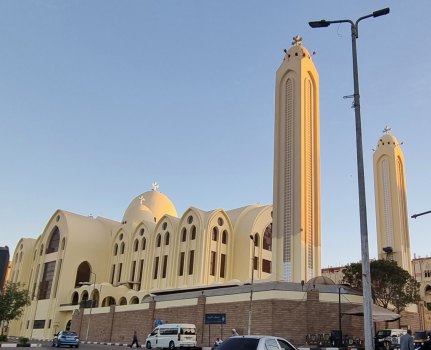 Plus voici la cathédrale copte. La 2ème d'Égypte par sa taille. Toute récente, lumineuse. Une bénévole nous donne des renseignements sur ce lieu pouvant accueillir 3000 fidèles (hommes à gauche, femmes à droite), et sur cette religion.