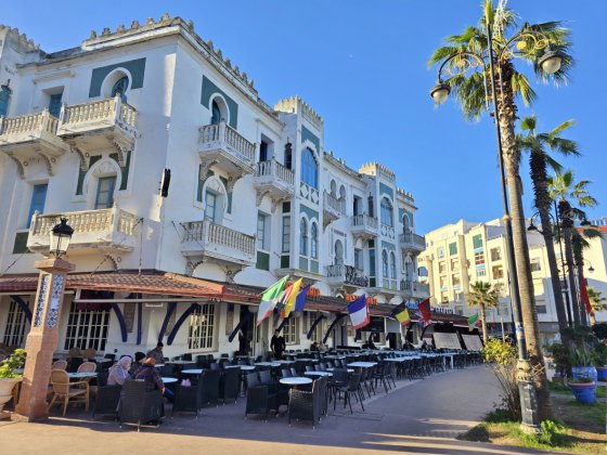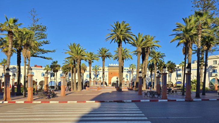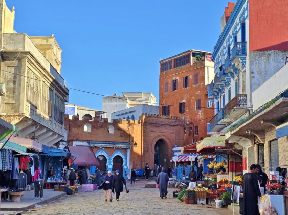 Puis direction la ville de Larache. Autour du port, il y a beaucoup d'activités : restaurants faisant griller du poisson, étalages de poissons. Avant d'aller s'en procurer, on fait un tour en ville. Elle est étagée sur la colline : habitat resserré, murs bleus, petites échoppes de produits nécessaires (cordonnier, couturier, primeurs, fleuriste, épicier... ) rien pour les touristes. Tout ceci, bien qu'entretenu, semble un peu délabré... mais les gens ont le sourire. En haut des ce quartier, une porte débouche sur la belle place de la Libération.