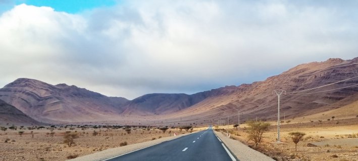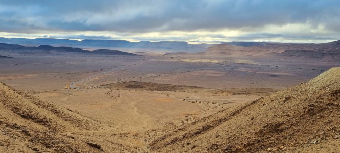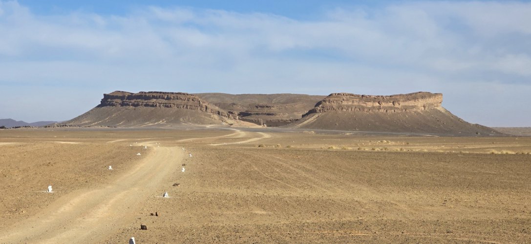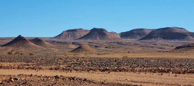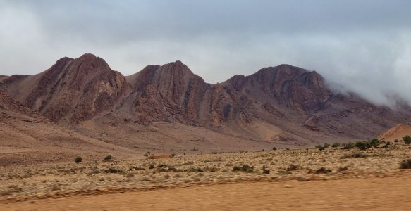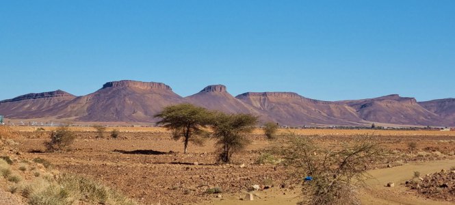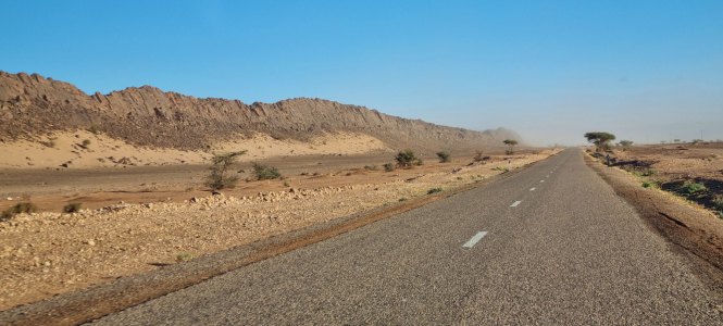Partis au lever du jour (8h30), nous roulons sous un ciel très bas jusqu'à Assa. On devine le relief qui a des formes surprenantes.