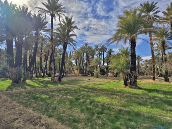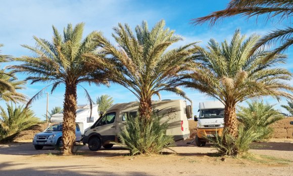 Vers 15h nous arrivons au camping Tissirt à Ouled Chaker qui est implanté dans la palmeraie. De là, on peut aller faire un tour à pied au milieu des palmiers au tronc noirci par un incendie il y a quelques années.