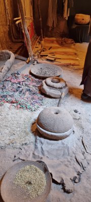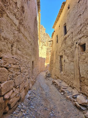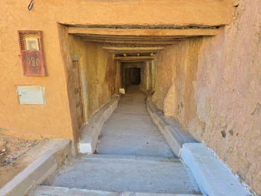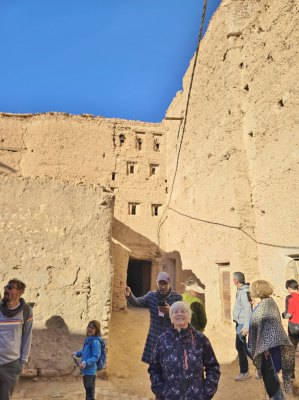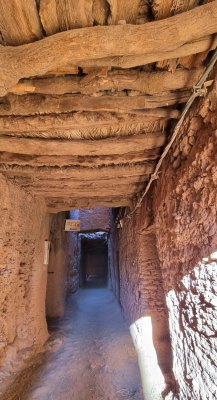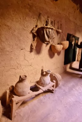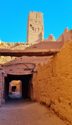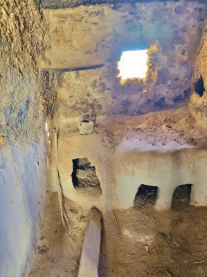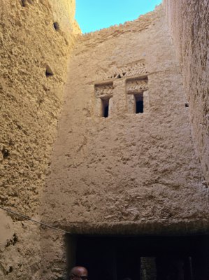Le vieux village qui tombe en ruine était construit pour que les habitants se protègent de la chaleur (ici en été, il peut faire 50° pendant 4 mois). Nous parcourons les sombres couloirs et arrivons devant la maison du grand père du guide. C'est une des mieux conservées. C'est une construction carrée sur 4 niveaux, avec au centre un petit patio qui fait puits de lumière, c'était un lieu de vie. Ensuite 2 étages car le grand père avait 2 femmes. Et un toit terrasse où on trouve la cuisine.