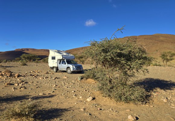Hier au soir, ce qui était prévisible est arrivé, nous ne sommes pas très loin de l'Algérie et les autorités veillent sur notre sécutité. Donc nous etions merveilleusement bien installés lorsqu'à 19h, un local est venu nous trouver. Il dit être le chef du village et veut nous envoyer à l'auberge de celui-ci. Ah, non, on ne bouge pas. Il repart. A la nuit, (20h) une voiture éclairée comme un sapin de Noël arrive. Ce sont les forces auxiliaires que le chef a fait venir. Ça parlemente mais nous n'aurons pas gain de cause. Il nous faut bouger pour notre sécurité et comme on ne veut pas aller à l'auberge, on accompagne les "militaires " jusqu'à leur base. Bon, on est moins bien installé, pas de ciel étoilé et surtout des rafales de vent qui nous secouent en tous sens.