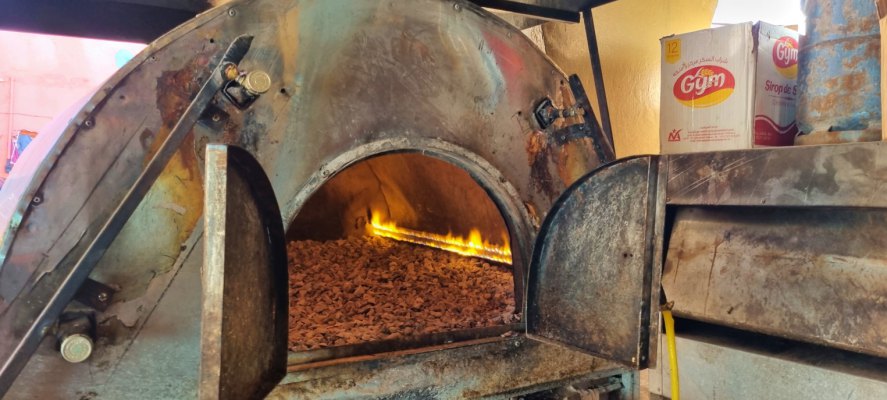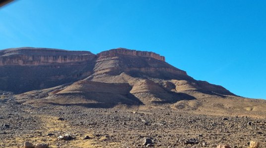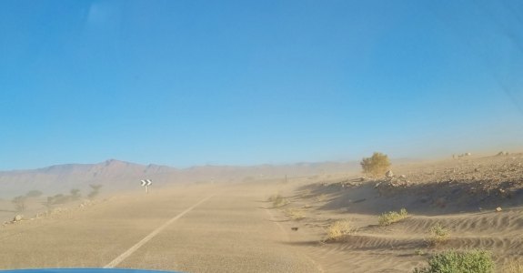 Ce matin départ à l'aube, ce qui nous permet de voir un magnifique lever de soleil. Puis toute la journée nous alternerons paysages magnifiques et vent de sable qui cache tout. A Tata on trouve un drôle de boulanger: son pain est ressemble à une pâte à pizza et surtout il le fait cuire sur un lit de gravier. Encore une fois, nous ne trouvons pas de viande, il ne reste dans les boucheries que des os et du gras un peu défraîchi.