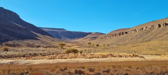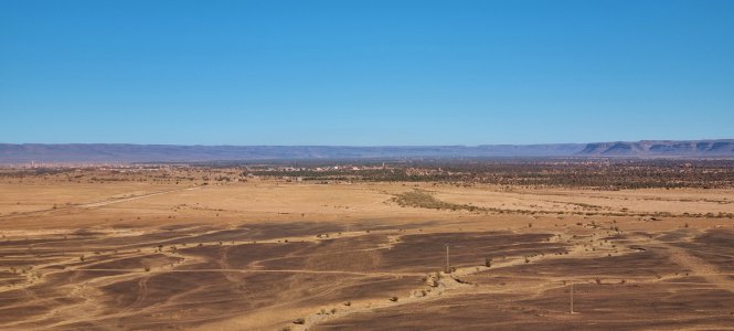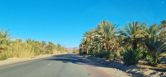 Le trajet Foum Zguid-Zagora nous fait suivre une large vallée aux étendues ni désertiques ni cultivées : un entre 2. Mais lorsqu'on approche de Zagora de grandes propriétés agricoles apparaissent : clôtures, plantations de palmiers, cultures sous tunnel, pompes alimentées par des panneaux solaires et grandes réserves d'eau.