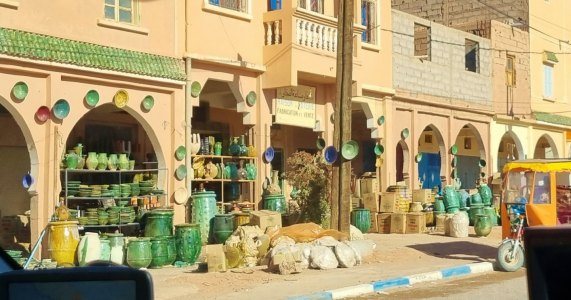 Zagora est devenue une ville moderne, le long de la rue principale les bâtiments sont neufs, bien entretenus. A l'entrée de la ville, un lieu attire la foule : c'est le souk. On y trouve de tout: d'abord des dattes de toutes les sortes (sèches, pâteuses, en vrac, en boîtes....) des melhfas ( grande pièce de tissu, de 4 à 5 mètres de long, que la femme enroule autour de son corps et fixe aux épaules avec des fibules), de la lessive avec du thé et de l'huile, des djellabas chaudes, des épices, des produits pour l'agriculture (plastiques, semences, sacs, outils....), de la quincaillerie, des bijoux berbères, des fruits et légumes. C'est animé, coloré, authentique.