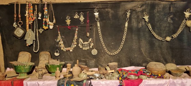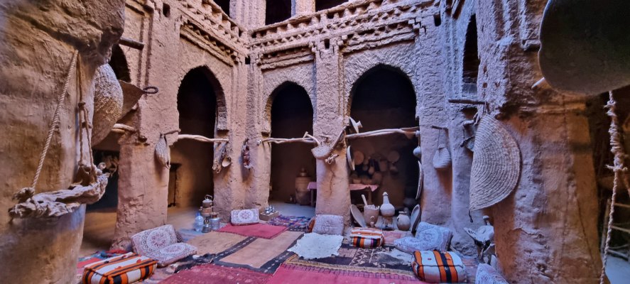 Nuit très calme et étoilée au camping La Boussole de Mhamid. Ce matin, direction le souk. Bon, et bien les Berbères ne sont pas très matinaux! Et c'est un tout petit souk où on trouve essentiellement les fruits et légumes de saison. Le tour est vite fait. Plus loin, on s'arrête à Ouled Driss pour visiter le musée maison traditionnelle. La première impression est excellente, la kashba est en bon état, peu de maisons tombent en poussière. Comme à Icht, on circule dans des ruelles couvertes, éclairées par des puits de lumière. On trouve la Maison Traditionnelle. C est une belle bâtisse, murs travaillés, plusieurs étages et objets du passé racontant la vie dans ces campagnes.