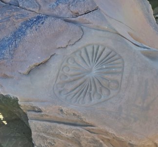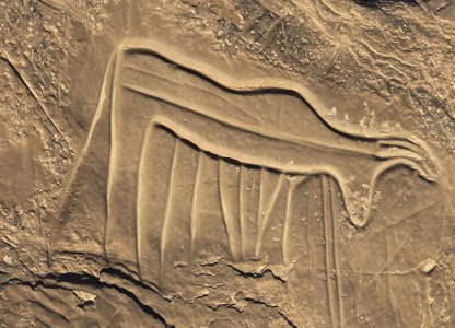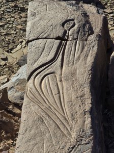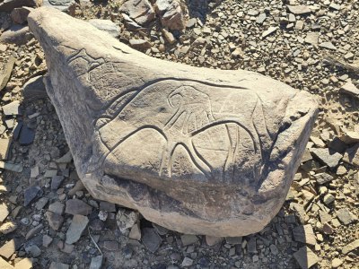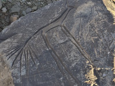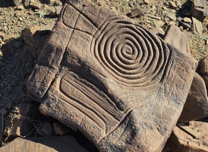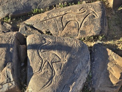 Ce matin, direction les gravures rupestres de Ait Ouazzik (30.68414° N, 5.64519° W). Après quelques kilomètres de route, on prend une piste. On suit un canyon au débouché duquel s'ouvre une vaste vallée. De-ci, de-là, des plantations de pastèque. Le site est sur une crête. Là, accompagnés par le gardien, Ahmad, nous découvrons des centaines de gravures au trait. Certaines sont mystérieuses. Le guide est précieux car les plus belles ne sont pas celles mises en évidence.