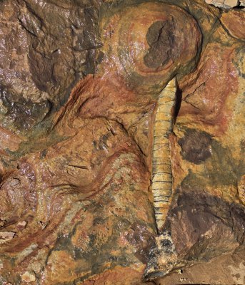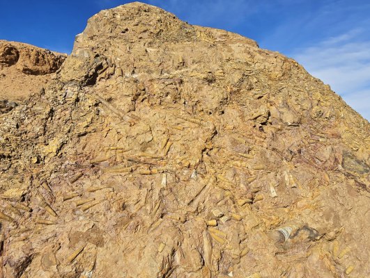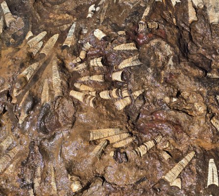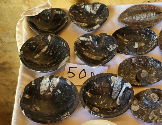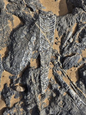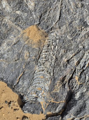 En début d'après-midi, on remonte encore plus dans le temps, à la carrière d'orthoceres(30.76371° N, 5.45731° W ). Dans ce site, accompagnés par Karim, nous découvrons ces fossiles de mollusques, les techniques d'extraction et les débouchés de ce marbre. Le problème c'est qu'il est travaillé à Erfoud, à 200 kms de là.
