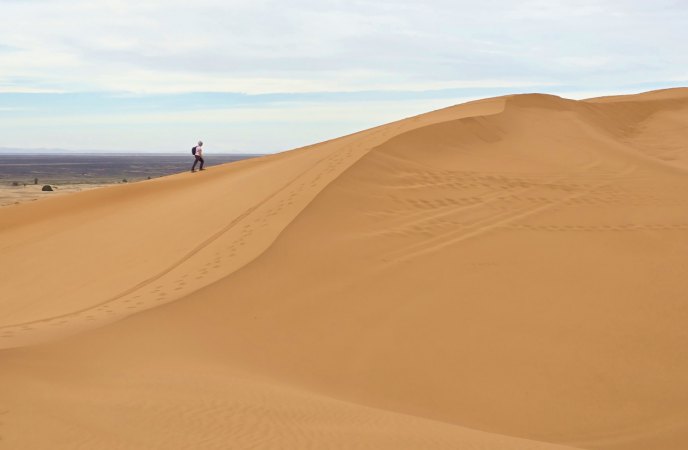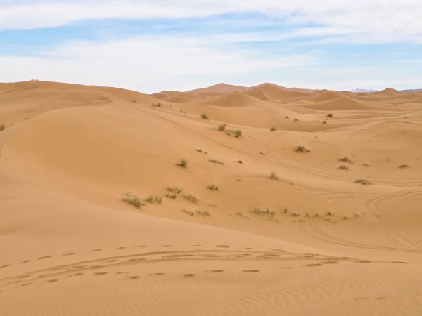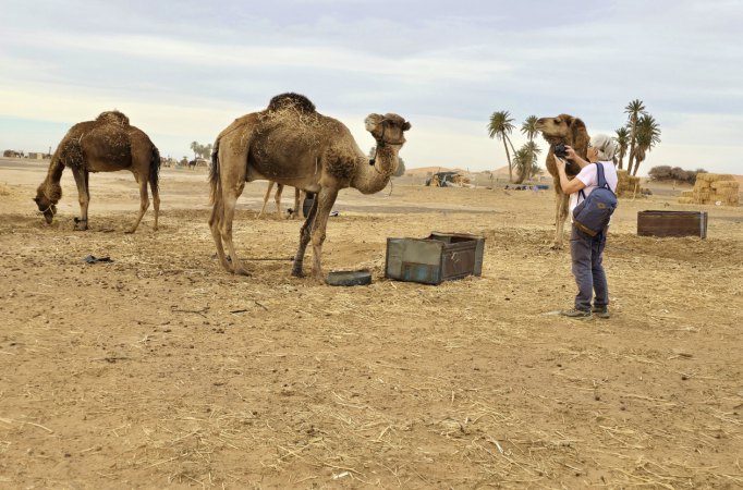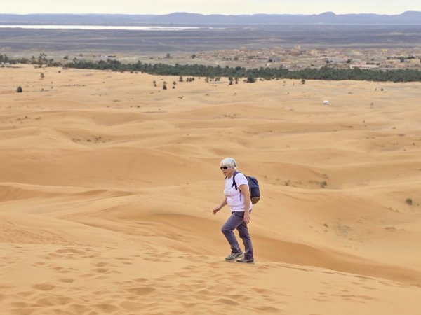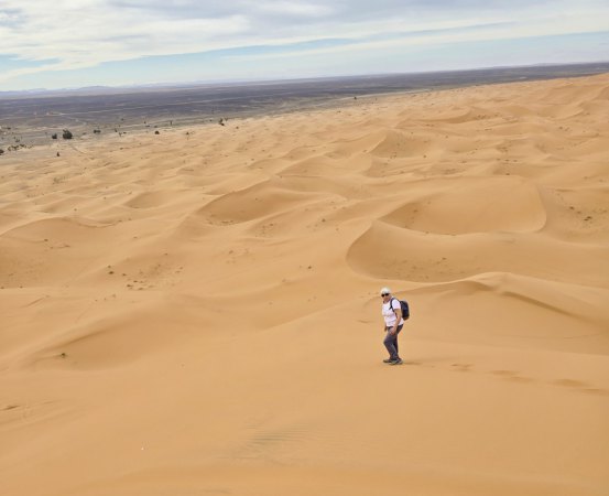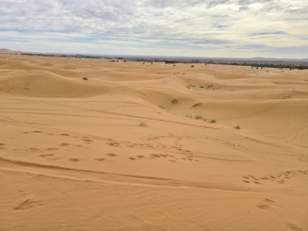 En milieu d'après-midi, nous arrivons près de Merzouga et allons au camping rustique "Océan des Dunes" (rustique car installations qui datent, mais tout est propre et l'eau chaude) où nous sommes très bien accueillis. On aime bien, il est situé à 2 pas de l'erg Chebi. En face du camping, les dromadaires attendent les touristes en mangeant ; une ligne de ketara s'étire (système d'irrigation traditionnel souterrain utilisé pour capter l'eau au pied de la dune). On n'a plus qu'à s'élancer à l'assaut de la plus grande dune. Comme le soleil est voilé, on ne transpire pas trop. Défi réussi ! Au retour une douche est bienvenue : on est un peu ensablés !