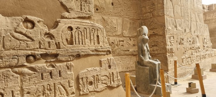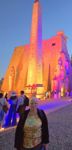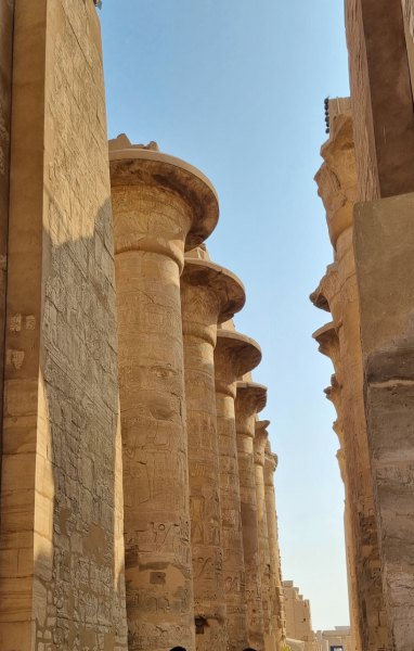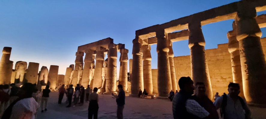 Dès notre arrivée nous faisons connaissance avec notre guideSayed puis nous nous dirigeons vers le temple de Karnac. Le temple de Karnak, dont le nom provient de l’arabe « al-Karnak » désignant une ville fortifiée, est en réalité un ensemble de temples entourés de trois enceintes. Pendant 2000 ans, depuis le règne de Sésostris Ier (environ 2000 avant J.-C.) jusqu’à la dynastie des Ptolémées, les pharaons ont construit, détruit et modifié les innombrables chapelles, temples et pylônes qui constituent le site de Karnak, nom moderne donné au temple d’Amon à Thèbes. Selon les croyances des anciens Égyptiens, Thèbes était le lieu de la création du monde, et c’est depuis le temple de Karnak que le dieu Amon-Rê intercédait avec le monde des vivants. Le site s'étend sur 24ha. À l’entrée, 40 sphynx à tête de bélier conduisent jusqu’à la grande salle hypostyle avec sa spectaculaire forêt de colonnes. Des murs gigantesques, des sculptures incroyables, des forêts de colonnes et partout des bas-reliefs, des hiéroglyphes. Notre guide nous parle des dynasties égyptiennes, du dieu Amon, nous explique beaucoup (trop) de choses. Les visiteurs sont innombrables mais cela n'est pas trop gênant : ce qui est à voir est en hauteur ! On finit la visite par l'allée des sphinx qui reliait ce temple et celui de Louxor.