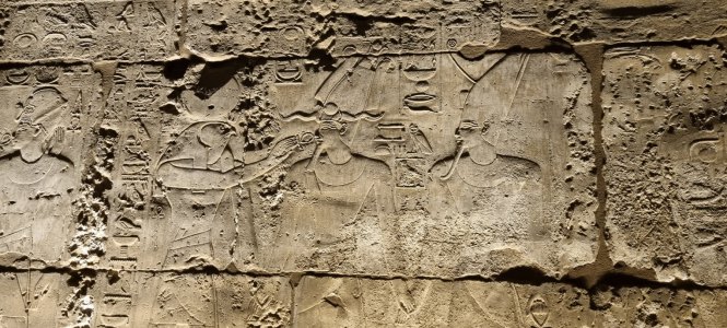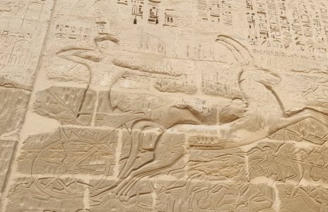 Dans les autres salles on admire une multitude de gravures. Les parois du temple se parent d'hiéroglyphes et de bas-reliefs. Le pylône d'entrée dévoile des scènes illustrant la célèbre bataille de Qadesh (1285 av. J.-C.), affrontement entre Ramsès II et les forces hittites. Puis le roi offrant animaux, oiseaux et poissons à Amon et Amonet ; le pharaon sacrifiant un oryx devant Amon ; ou encore le souverain portant des vases d'onguent sacré. Les bas-reliefs ornant la grande colonnade narrent le voyage des barges royales et divines sur le Nil, entourées d'une foule massée sur les berges. 19h30, retour au bateau. Repas en groupe puis au lit.