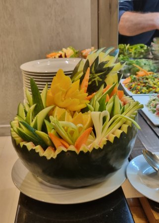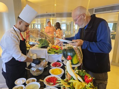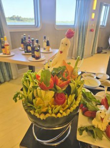 Sur ce bateau, 72 personnes travaillent (45 jours embarqués, 15 jours chez eux). Tout le personnel est souriant et attentif : au buffet, tout est bien présenté, les chambres sont nettoyées chaque jour et le personnel fait une décoration avec les serviettes de toilette, hier des cygnes, aujourd'hui un crocodile.