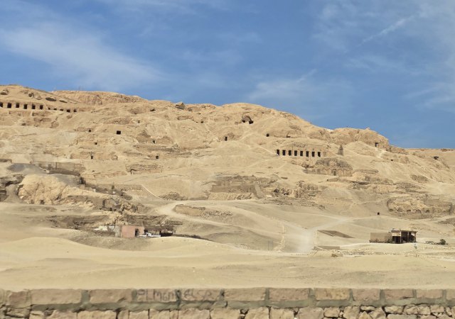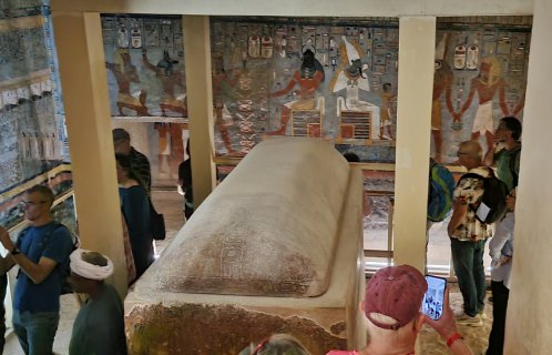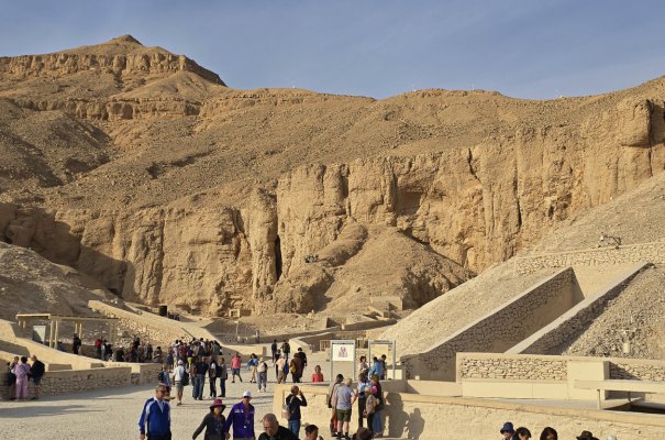 Aujourd'hui, on ne se lève qu'à 6h ! Départ à 7h pour la Vallée des Rois. Le site lui-même n'a rien d'extraordinaire : un recoin au milieu des pierres. Abandonnant les pyramides, les pharaons thébains ont opté pour des tombes souterraines secrètes, creusées dans la roche de cette vallée isolée. L’objectif était double : assurer la sécurité éternelle de leur dépouille et de leur trésor funéraire contre les pillards, et s’inscrire dans une puissante symbolique divine liée à la montagne qui surplombe le site, en forme de pyramide.