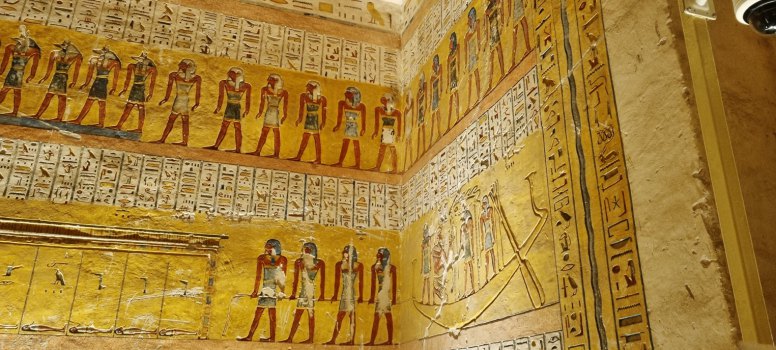 La 3ème, la tombe de Ramsès 4 a un couloir d'accès très photogénique car en ligne droite. Des colonnes de hiéroglyphes décorent les parois et le plafond est aussi peint. D'après notre guide, toutes ces belles couleurs sont d'origine ; on a du mal à croire qu'elles ont 4000 ans!