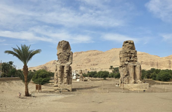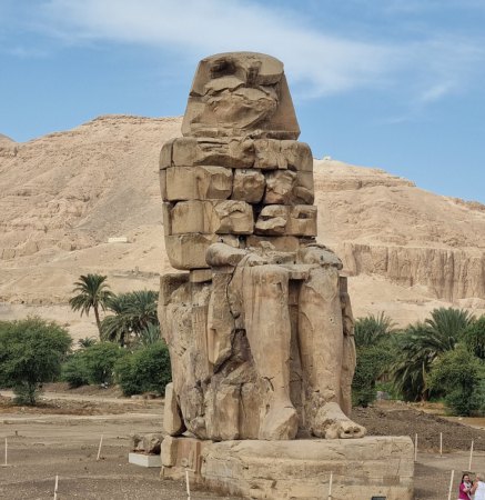 Après cela, encore un détour pour les Colosses de Memnon. Chaque statue mesure 14 mètres de haut, pèse 700 tonnes, et s'élève sur un piédestal de 4 mètres de haut, pour un poids de 600 tonnes. Au total, l’ensemble mesure 18 mètres de haut et pèse plus de 1 300 tonnes ! Certaines parties de la tête et de la coiffe des colosses semblent manquer. La hauteur réelle aurait donc pu être d'environ 21 mètres.