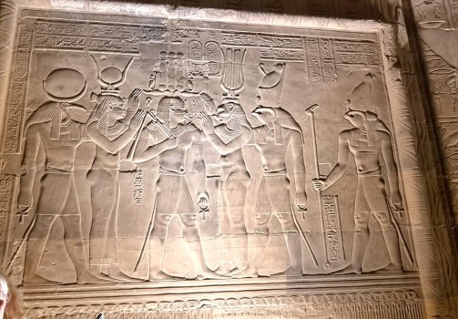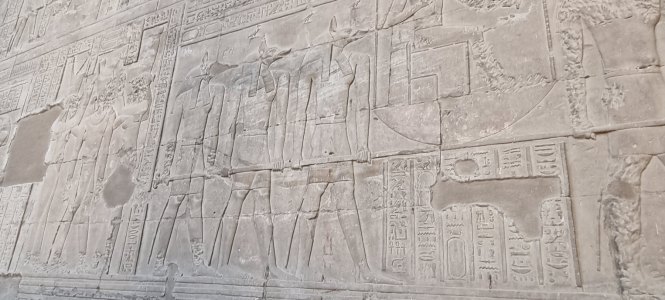 En début de soirée le navire fait escale à Kom Ombo. Nous allons y visiter un temple double : d'un côté il célèbre le dieu du mal le dieu crocodile Sobek , la déesse Hathor et le dieu fils Khonsou et de l'autre , le dieu faucon Haroéris, la déesse Tasentnefret, la "Bonne sœur", et au dieu fils Panebtaoui, le "Maître des Deux Terres", qui symbolisent le bien et la guérison. Les personnages gravés sont extraordinaires de netteté et ici ceux du bas sont en meilleur état que ceux du haut car ils sont longtemps restés enfouis dans le sable. Notre guide en profite pour nous expliquer le calendrier égyptien (ou calendrier copte) encore utilisé pour l'agriculture. Il avait 3 saisons : l'avant crue, la crue et l'après crue, le Nil rythmait la vie. (Depuis la construction du barrage, plus d'inondations). Donc 3 saisons de 4 mois formés de 3 semaines de 10 jours.... et les 5 jours qu'il manquait étaient pour prier, et donc faire des offrandes : tout cela est gravé dans la pierre !