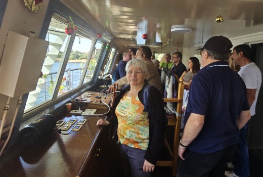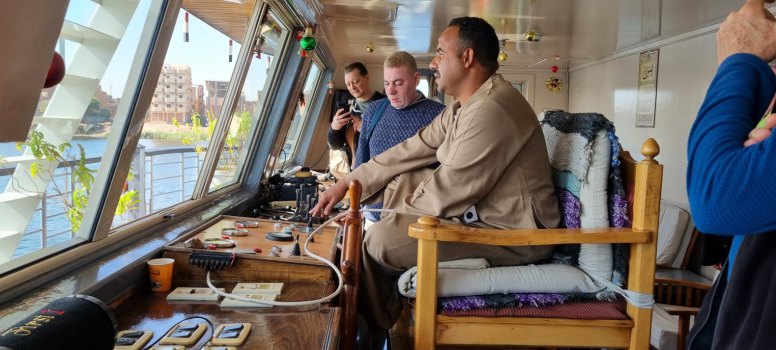 De retour au bateau, on peut entrer dans le poste de pilotage. Le pilote, assis en tailleur, tient la barre avec les pieds et guide le bateau au joystick, les yeux rivés sur l'horizon. Le Nil a une largeur entre 500 et 700m, mais comme 280 bateaux comme le nôtre le parcourent il faut être attentif. De plus ce fleuve est peu profond, 7 à 8m, et le navire a un tirant d'eau de 1m40.