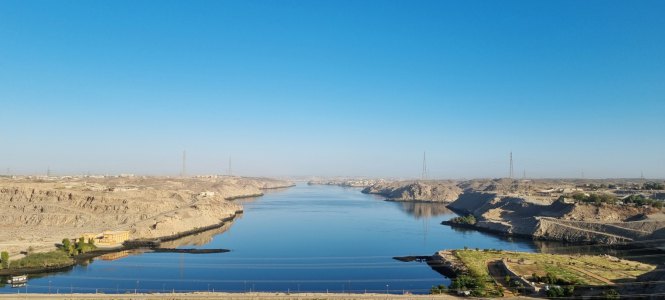 Ce matin, avec le groupe, nous partons pour le grand barrage d'Assouan, qui a créé le lac Nasser. Ce lac mesure 500 kms de long, 17 kms au plus large. Sa réserve d'eau permet d'approvisionner l'Égypte pendant 2 ans. Maintenant la question est de savoir si ça continuera, non pas à cause du réchauffement climatique mais parce que les Éthiopiens ont fait un barrage sur le Nil bleu, ce qui coupe une partie de l'eau.