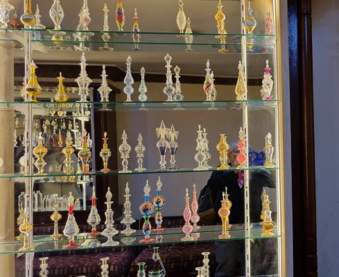 Retour côté ville où nous arrêtons dans un commerce d'huiles essentielles. Assouan est réputée pour cette production. Elles sont extraites à froid. Elles n'ont pas d'alcool, donc pas d'évaporation. Ensuite on teste, il y a les essences parfumées simples, les mélanges (qu'ils nomment par le nom de grands parfums) et les huiles médicinales décrites pour leurs vertus. On se laisse tenter par un Musk aux vertus anti migraine (35€ les 50ml.... on ne sait pas si c'est cher ou non, on n'y connaît rien !).