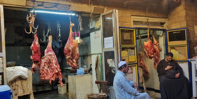 Puis le marchand de teeshirt plaisantant, prêt à déballer son magasin. Entre temps on passe devant le boulanger et ses petits pains plats, le boucher aux gros quartiers suspendus à des esses : ici du chameau, là du mouton, mais la star c'est le bœuf ! Les épices embaument les allées.