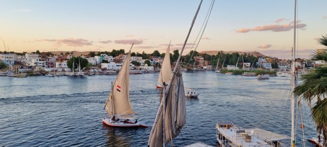 Repas avec beaucoup de choix, puis on peut enfin se reposer un peu dans la cabine. C'est bien équipé, avec un lit gigantesque. Seul inconvénient, notre bateau est à quai, coincé entre 2 autres hôtels flottants donc pas de vue. A 16h30, on monte sur le pont supérieur, c'est déjà l'heure du coucher de soleil. Les felouques se détachent dans le soleil couchant.
