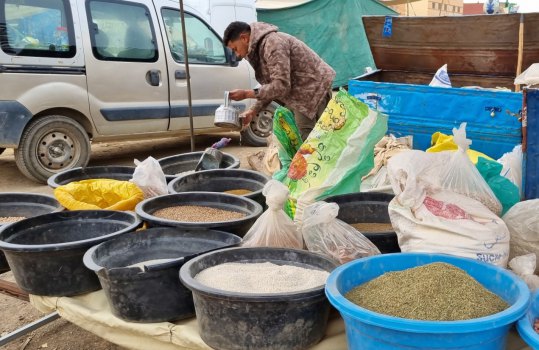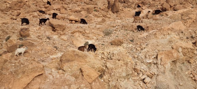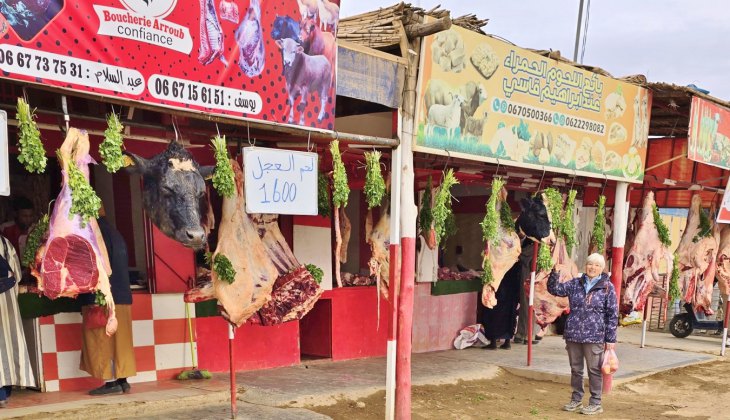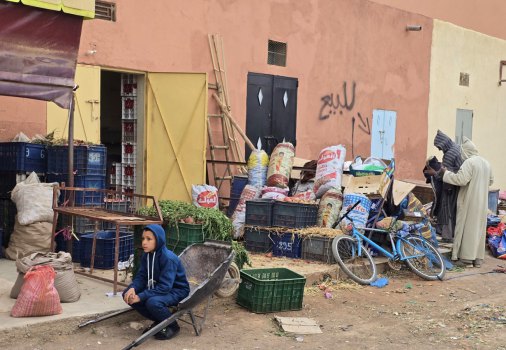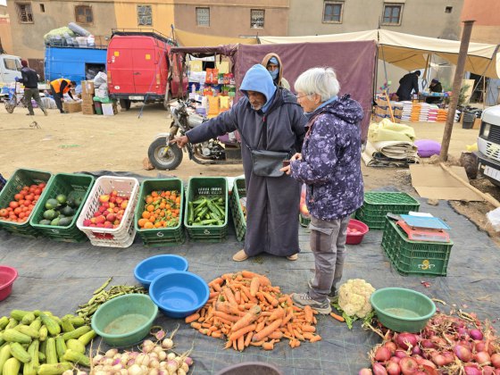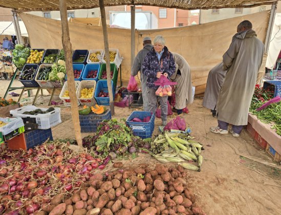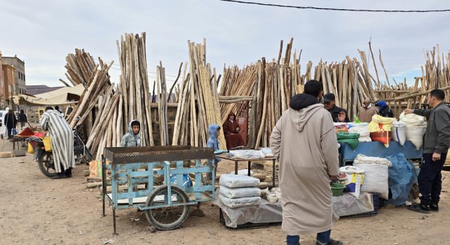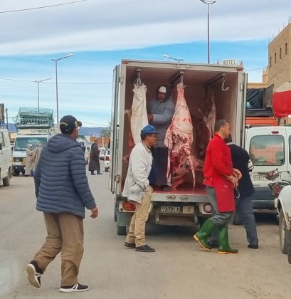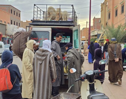 Aujourd'hui, c'est le souk du samedi à N'Kob. C'est le rendez-vous de tous les habitants des alentours. Grandes djellabas d'hiver avec une capuche, châles noirs brodés pour les femmes, turbans blancs ou indigos pour les anciens. L'espace semble trop petit pour la profusion de marchandises. Amandes régionales, fruits, légumes, vêtements, outillage.... Ici, le vrac (épices, légumineuses, pâtes, riz...) est présenté dans des récipients pas très "cleans". Quelques boutiques sont réservées à la viande ; des grosses cuisses de bœuf, des moutons entiers (mâles de préférence avec leurs attributs qui se voient bien) sont accrochés par des esses en devanture... à côté de la tête de l'animal tué. Moutons et chèvres attendent l'acheteur, dans la rue, sur le toit des camionnettes.