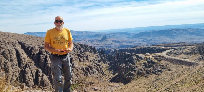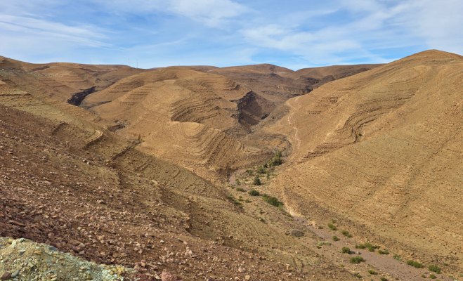 Un peu avant midi nous atteignons Tinghir. C'est de là que débute la route pour traverser le Djebel Sarhro. Elle n'est pas enneigée, donc allons-y. On prend la route à la sortie de Tinghir (juste après la station-service Shell). Elle monte tranquillement, traverse de hauts plateaux. A l'approche du col Tizi'n Tazazert, les roches deviennent plus noires. On passe ce col (en pensant bien à notre précédent passage en 2013, où on avait bien galéré dans les cailloux), et on amorce la descente aux passages très pentus. La route est magnifique, les paysages minéraux, sauvages, grandioses. On arrive dans une gorge abritée, là les cultures sont très vertes, les amandiers commencent à fleurir.
