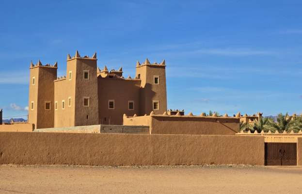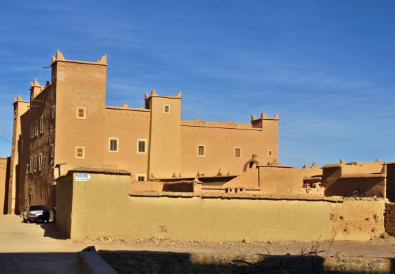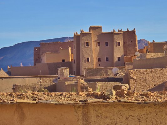 Au bout de la plaine, voici N'Kob, la ville aux 45 kasbahs. Une fois posés au magnifique camping Ouadjou (tempête de ciel bleu, 35°au soleil), on part à la découverte des kasbahs. Oui, il y en a une multitude, mais elles sont encerclées de murs de 4m de haut. La plupart servent d'hôtel et ont été reconstruites en "dur". L'abondance de kasbahs témoigne de la sédentarisation progressive des tribus nomades de l'Anti-Atlas qui ont investi leurs richesses dans des structures permanentes en pisé (terre crue).