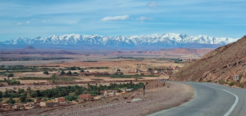 La route entre Agdz et Ouarzazate, toute neuve, est magnifique : elle traverse un massif montagneux aux canyons profonds et aux roches colorées, avec en toile de fond l'Atlas enneigé.