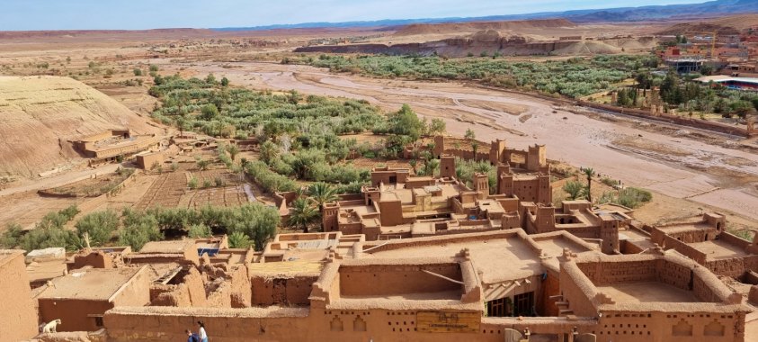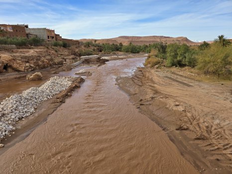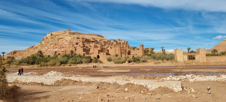Dernier arrêt de la journée à Aït Benaddou. Comme on n'a pas vu immédiatement la passerelle récente, on traverse l'oued à gué. C'est un peu scabreux. Le ksar est toujours magnifique de loin, et les bâtiments restaurés à mesure. Là, l’architecture en terre crue persiste. Mais c'est tellement touristique que le lieu a perdu son âme. Plus de convivialité... même les marchands de souvenirs semblent indifférents... pas un sourire.