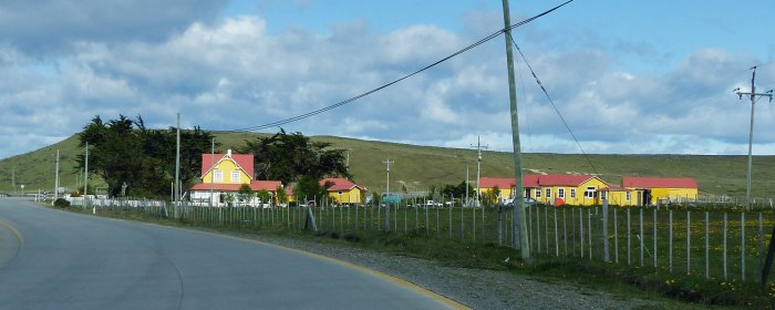 Sous un beau soleil, nous quittons ce bivouac que nous avons partagé avec des Caracaras (rapace au bec rouge) et des chenilles. La route en Ripio que nous avons prise et qui se dirige sur Porvenir, est très belle. Nous roulons entre l’océan, aujourd’hui bleu roi, et les prairies parsemées de moutons. En ce printemps, les agneaux gambadent dans les prés. Les Estancias semblent plus petites que du côté argentin, mais surtout elles sont plus coquettes : murs de couleurs vives, entrées décorées. Quelques petits baraquements de pêcheurs sont sur la côte, avec une ou deux barques jaunes posées sur la grève et des cabanons en tôle. Parfois, un groupe de Guanacos traverse la route.
