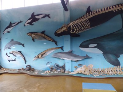 Juste à côté, on a pu visiter le musée Acatushun, qui nous a vraiment passionnés. Nous avons rencontré Sarah, guide bénévole francophone, ayant une très grande connaissance de la faune marine des régions polaires. Grace à elle nous avons pu profiter pleinement de ce hall d’exposition très bien fait. Une biologiste anglaise, Nathalie Prosser Godall, a collecté sur les plages, pendant des années des squelettes de mammifères marins, les a nettoyés, répertoriés. Maintenant, on peut voir aux murs, des dessins représentant ces animaux de taille réelle, avec placé devant le squelette correspondant. Grace à cela, on peut comparer les tailles, les dentitions, les modes de propulsion. On a droit à une visite de la cabane de traitement des squelettes, avec ses tonneaux ou macèrent les corps, ses chaudières servant à les faire bouillir une fois bien ramollis, les tables où sont nettoyés tous les os, les bacs où se putréfient les têtes (qui ne peuvent pas bouillir sinon elles perdent leurs dents). Pour ce musée, on ne regrette ni les 40 kilomètres de piste, ni d’être avec notre véhicule, ce qui nous a permis de nous attarder.