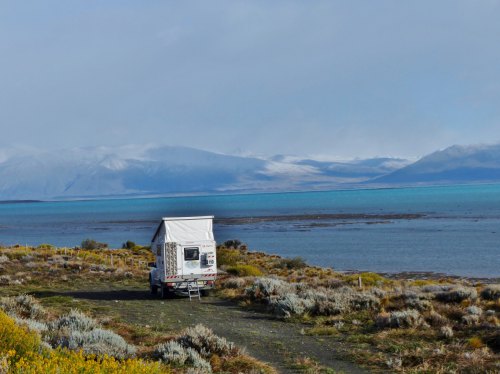 A la sortie du parc (on n’a pas le droit d’y rester après 19h), nous cherchons un bivouac. Le bout du lac Roca est sauvage à merveille, mais il est aussi très plat, sans grande végétation. Si on s’installe là et que le vent se lève, on va se faire secouer, alors on reprend la route, direction El Calafate. Au plus près du lac Argentino, Jean-Noël repère un petit replat, légèrement en contrebas de la route, partiellement abrité. On s’y installe, face à une vue extraordinaire : à nos pieds le lac et en face, une chaine enneigée. Lat -50.3239 Lon -72.5649